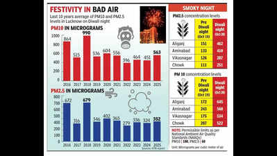 Lucknow: Lucknow recorded high pollution levels this Diwali night compared to the last three years of the festival. Both superfine pollutants, PM10 and PM2.5, were more than five times higher on the Diwali night (Oct 20) than the permissible limits set by the National Ambient Air Quality Standards (NAAQS). Compared to 2024 Diwali night, PM10 and PM2.5 concentrations surged by 24.6% and 8.8%, respectively, this year.This was revealed in a study conducted by the Indian Institute of Toxicology Research (IITR), which assessed ambient air quality in the city during Diwali at four locations: Aliganj and Vikasnagar (residential), and Aminabad and Chowk (commercial). The report was released on Thursday.The PM10 and PM2.5 were monitored by IITR on pre-Diwali (Oct 19), Diwali (Oct 20) and post-Diwali (Oct 21) for both day and night periods.Results indicated a substantial deterioration in air quality: with PM10 average concentration recorded at 563 micrograms and PM2.5 average concentration at 352 micrograms on Diwali night, exceeding the NAAQS of 100 micrograms per cubic meter of air and 60 micrograms per cubic meter of air, respectively. Aliganj and Aminabad were the most air-polluted localities on Diwali night. The air quality was monitored from 6pm on Oct 20 to 6am on Oct 21.Meanwhile, location-wise monitoring on Diwali night revealed extremely high particulate matter concentrations at all four locations monitored by the IITR team, with PM10 peaking at Aliganj (645 micrograms), followed by Aminabad (560 micrograms), Vikasnagar (534 micrograms), and Chowk (522 micrograms), showing an average increase of 183% over pre-Diwali levels.More alarming was the pollutant PM2.5, which is significantly finer than a hair strand and can lead to respiratory issues if inhaled. It reached a maximum of 462 micrograms at Aliganj, followed by Aminabad (410 micrograms), Vikasnagar (287 micrograms), and Chowk (251 micrograms).However, a 10-year trend analysis revealed recurring surges in PM10 and PM2.5 during Diwali nights. Although a gradual decline was observed from 2018 to 2024, both PM10 and PM2.5 concentrations on this year’s Diwali night were significantly higher than in 2024.Monitor progress of pollution curbing steps: ScientistsIITR scientists said though measures to curb pollution such as certified green crackers, designated zones for bursting firecrackers and restricted timings, public awareness campaigns, and post-festival clean-up were put in place, their effectiveness in Lucknow is questionable. Instead, it is recommended that effective real-time monitoring of the implementation of these measures must be done on urgent basis, said the scientists.