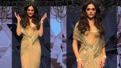 Aneet made her runway debut looking absolutely surreal. The actress walked the ramp in a golden sequin drape that reimagined the traditional saree with a modern twist. The outfit beautifully blended Indian heritage with contemporary style, giving her an elegant and powerful presence on stage.According to an Instagram post shared by the designer, the golden saree-inspired dress was crafted using metallic sequins and embellished with Swarovski crystals. The gown featured a corseted bodice with a sweetheart neckline, while the pallu, pleated neatly on one shoulder, created the illusion of a classic saree.As Aneet glided down the runway, she blew a sweet flying kiss to the audience, looking every bit the showstopper.