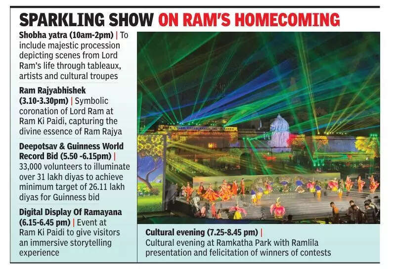 On the eve of ninth Deepostav on Sunday, Ayodhya was bustling with celebratory energy as preparations for the grand event were in the final stages. While on one hand volunteers were seen arranging earthen lamps along the ghats, artisans were busy finalising the tableaux for the Shobha Yatra near the Saket Degree College campus. Safai workers spent the day cleaning the roads leading to the Ram Ki Paidi where a huge screen was put up for the Deepotsav signature sound and light show.By Saturday evening, rehearsal for the newly included drone show also amused the locals and visitors alike. Tourism and culture minister Jaiveer Singh said: “Over the years, Deepotsav has grown from a bright idea into a living model of how faith, culture and technology can come together for people.” As the temple town readies for ninth edition of Deepotsav, TOI compiles nine attractions of the mega event.1. Eyes on new Guinness Record – In 2017, when the UP govt conceived and organised the first Deepostav the target was to illuminate as many earthen lamps as possible. In 2024, over 25 lakh earthen lamps were lit. The state also earned a Guinness Record for largest display of oil lamps, including 27 lakh earthen lamps of which 25,12,585 were illuminated. This year, govt has a new target– 26.11 lakh lamps.2. Three new ghats: Laxman Kila Ghat along Saryu besides Rajghat, Guptar Ghat and Nageshwar Ghat— to expand celebration. 3. Army of volunteers : The organisers mainly the Ram Manohar Lohia Avadh University – have mobilised an army of 33,000 volunteers. Comprising students, teachers, social workers, local youth groups, business communities and so on, these volunteers work in sync to light up diyas and ensure wind is no threat to their flame.4. Saryu maha aarti by 2100 Vedic scholars : To add to the aura of Ayodhya, a maha aarti of the Saryu has been included in the flow of events. Along the ghats, as many as 2100 Vedic scholars will perform a grand maha aarti amid rhythmic blend of chants, bells and conches forming one vast wave of sound and light. 5. Vanar Sena: About 100 children from families living in Ayodhya city and its villages will metamorphose into a Vanar Sena to lead the grand Shobha Yatra. Shobha Yatra of tableaux presents seven chapters of Ramayana from Bal Kaand to Uttar Kand. 6. Virtual reality: Tech inclusions comprise AR App developed by UP Tourism allows visitors point phones at key locations along Ram ki Paidi for scenes from Ramayan. Devotees can experience it online as Divya Ayodhya App. 7. Tech upgrades: AI-driven monitoring system tracks crowd density and movement in real time. The moment a ghat or corridor is congested, the system would trigger alerts, guiding volunteers to open alternate routes. Ayodhya skies will come alive with 1,100 Made-in-India drones forming images of Hanuman carrying the Sanjeevani Mountain, the Ram Setu, and Janmabhoomi Mandir. 8. Minimum Carbon footprint: Govt has done away with firecrackers and replaced it with a 3D holographic laser show at Ram ki Paidi. Use of technology will create firework-like ambience. 9. Power SHG women: Over 70 Self-Help Group stalls featuring bamboo and moonj crafts, jute thalis and sakhi-branded prasad boxes made by women artisans. These small enterprises turn the festival into a source of livelihood, and the rising visitor footfall ensures that Ayodhya’s glow translates into local prosperity. The fest has also empowered potter families in Ayodhya and adjoining districts.