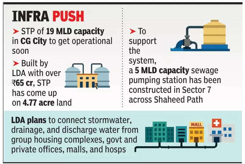 Lucknow: The Sewage Treatment Plant (STP) of 19 MLD (million litres per day) capacity in CG City, which is fully constructed but not yet operational, will soon start catering to sewer connections of nearly 2.5 lakh residents of group housing complexes and those working in offices, hospitals, and malls in Sectors 6 and 7 in Gomtinagar Extension.Once the sewer connections from Gomtinagar Extension are established, the plant will begin treating wastewater generated from residential and commercial buildings in the area, said an official. Built by Lucknow Development Authority (LDA) with over Rs 65 crore, the STP has come up on 4.77 acres. Many of the existing buildings in the locality were built about a decade ago with septic tanks and sewer lines. The sewer pipelines used to discharge untreated sludge into drains that eventually flowed into the Gomti river. “Since the population in the area was low earlier, there was no sewage overflow. But with the new system, all sludge will be properly treated,” said an official. To support the system, a 5 MLD capacity Sewage Pumping Station (SPS) has already been constructed in Sector 7 across Shaheed Path. Work is currently underway to complete the power connection there so that sewage can be efficiently transferred to the CG City STP. LDA vice chairman Prathamesh Kumar recently inspected the STP to review its readiness. During his visit, he found irregularities at the electrical station and server room and imposed a penalty of Rs 10 lakh on the executing agency. He instructed officials to resolve all issues and make the STP functional within 15 days. Officials said that before the plant becomes operational, all sewer lines from Sectors 6 and 7 will be cleaned and connected to the facility. The plant’s high capacity will also be utilised by linking it with the overflow from the Sewage Pumping Station in Sector 4, Gomtinagar Extension. The LDA has also planned to connect stormwater, drainage, and discharge water from group housing complexes, govt and private offices, malls, and hospitals in Sectors 6 and 7 to the STP. This initiative will help improve sewage management and reduce environmental pollution in the rapidly growing residential and commercial hub of Gomtinagar Extension.