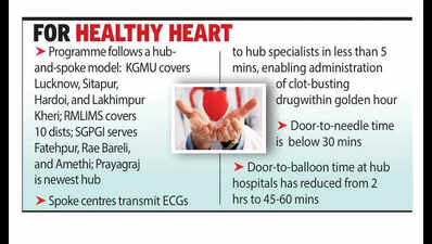 Lucknow: When Rajesh Verma, 41, (name changed) from Barabanki experienced severe chest pain late at night, his family rushed him to the district hospital. An ECG was performed immediately, and through the HRIDAY SETU (STEMI Care UP) hub-and-spoke model, doctors at the district hospital shared the results with specialists at Ram Manohar Lohia Institute of Medical Sciences (RMLIMS). Experts interpreted the findings within minutes, guided emergency treatment locally, and arranged his transfer to RMLIMS for advanced care.“If timely treatment was not given, he would have died,” said Prof Bhuwan Tiwari, head of cardiology at RMLIMS. “Without HRIDAY SETU, it wouldn’t have been possible to get expert solutions so quickly and effectively,” he says.Cases like Rajesh’s illustrate the programme’s purpose, officially launched at KGMU on March 24, to provide rapid, guideline-based treatment for heart attack patients across Uttar Pradesh, including remote areas. After KGMU, RMLIMS joined in May, SGPGI in June, and Prayagraj most recently in Aug.According to official reports till Aug 17, from Prof Tiwari, 9,554 suspected heart attack patients underwent ECGs across 17 districts. Of these, 398 were confirmed STEMI cases, and 236 received thrombolysis before transfer to advanced centres.The programme follows a hub-and-spoke model: KGMU covers Lucknow, Sitapur, Hardoi, and Lakhimpur Kheri; RMLIMS covers 10 districts; SGPGI serves Fatehpur, Raebareli, and Amethi; Prayagraj is the newest hub.A key achievement has been the reduction in treatment delays. Using simple tools like WhatsApp, spoke centres transmit ECGs to hub specialists in under five minutes, enabling Tenecteplase, a clot-busting drug, to be administered within the golden hour.Prof Rishi Sethi, HOD, Cardiology, KGMU, said, “The clinical importance of timely STEMI care cannot be overstated. By empowering district hospitals to diagnose and start treatment, we not only save lives but also preserve heart muscle and improve long-term outcomes for patients who previously had limited options.”Reports indicate that “door-to-needle” time has dropped below 30 minutes in most cases, while “door-to-balloon” time at hub hospitals has reduced from two hours to 45–60 minutes.Prof Aditya Kapoor, HOD, Cardiology at SGPGI, added, “While fewer patients come to institutes after initial treatment, the programme has proven how technology, training, and teamwork can transform cardiac emergency care.”To support the initiative, 400 healthcare professionals across 45 spoke facilities have been trained, and all centres are equipped with ECG machines and thrombolysis kits. Treatment at spoke hospitals is free, while advanced procedures are covered under the Ayushman Bharat scheme. Prof Tiwari said, “Impact of timely thrombolysis is enormous; many patients who underwent angiography afterward had near-normal arteries and did not require stents.” Challenges remain, including the absence of a centralised digital data system.