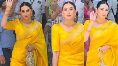 Karisma Kapoor recently caught everyone’s attention at Mumbai airport, looking completely elegant. On Thursday, she stepped out of her car, waved to the paparazzi, and posed gracefully, glowing in a bright yellow saree.