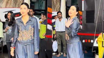 Karisma Kapoor stepped out to shoot on 18 August during heavy Mumbai rains. She looked elegant in a jumpsuit with her hair tied in a neat ponytail. As she walked out of her vanity van, she spotted the paparazzi waiting. She quickly went back inside, but soon stepped out again to pose in the rain-soaked city. Even though she smiled for pictures, she rushed back in despite the paps calling out to her repeatedly.