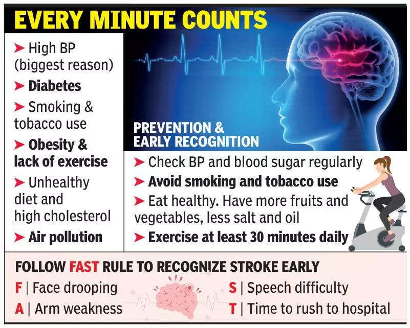Lucknow: Eight out of 10 strokes can be prevented through simple changes in lifestyle like exercising regularly and quitting smoking and keeping blood pressure and diabetes in check. On the eve of World Stroke Day (Oct 29), experts urged people to recognise stroke as a medical emergency.Neurologists warned stroke cases were on rise in UP and called for stronger public awareness and better access to treatment. As per estimates, over 3.4 lakh people in UP suffer stroke every year, but only 30% population has access to stroke-ready hospitals, which, combined with poor awareness and delayed treatment, costs countless lives, especially in rural areas. “Stroke is no longer disease of elderly,” said Prof R K Garg, former head of neurology at KGMU. “We see patients in their 30s and 40s with high BP and diabetes and almost 70-80 per cent cases could be prevented if they knew risks and acted timely.” He said young workers who sit for long hours, skip exercise and consume junk food are reporting early signs of hypertension and diabetes — both strong triggers for stroke.A stroke occurs when blood flow to brain is blocked or when blood vessel bursts, cutting off oxygen to brain cells, which start dying within minutes, leading to paralysis, speech problems, or even death. Response within 4.5 hours can save lives and prevent disability. “Golden window for treatment is few hours. Every minute counts as time lost is brain lost,” explained Prof DK Singh, head of neurosurgery at Dr Ram Manohar Lohia Institute of Medical Sciences, citing example of a 45-year-old from Barabanki who reached hospital within two hours of slurred speech and facial drooping. “Timely arrival helped us dissolve clot with injection and he recovered fully,” he said. Clot-busting injections and mechanical thrombectomy (a procedure to remove clots) are available in large city hospitals, while patients from smaller towns and villages often reach too late to benefit. “More stroke-ready centres at district hospitals, trained emergency staff and wider awareness is must,” said Dr Singh.Head of neurology department at KGMU, Prof Rajesh Verma, said only few hospitals in state perform thrombolysis (clot-busting treatment) and thrombectomy (clot removal). “Less than 1% of eligible stroke patients in UP actually receive thrombolysis as most arrive at hospitals too late, while absence of 24×7 CT scans, shortage of specialists, and low public awareness are othe hurdles,” he said, adding that in many cases, families first try home remedies or visit local clinics and lose precious hours.Director of neurology at Medanta Hospital, Dr Anup Kumar Thacker, president of Society for Acute Care, Trauma and Emergency Medicine, Dr Lokendra Gupta and interventional neuroradiologist at Apollomedics Hospital, Dr Dewansh Mishra, said long exposure to polluted air in industrial zones or traffic-heavy areas raises risk of blood vessel inflammation. They recommended upgrading hospitals under Ayushman Bharat, improving district-level emergency care and running continuous public awareness drives.President of Society for Acute Care, Trauma and Emergency Medicine, Dr Lokendra Gupta and society’s vice president said to reduce state’s stroke burden combining preventive care, quick emergency response and strong public education were needed.Doctors agree problems in UP include delayed arrival of patients, limited stroke-ready hospitals, high treatment costs and shortage of trained staff and urged people to learn to identify early signs such as sudden weakness, facial drooping, or slurred speech. If someone fails to lift one arm or smile is distorted, even if for a few minutes, they should rush the person to nearest hospital.