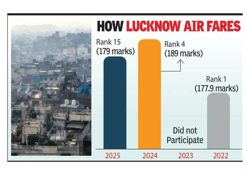 Lucknow: State capital tumbled 11 places to secure 15th rank among 47 cities with population exceeding 10 lakh in Swachh Vayu Sarvekshan-2025. The city scored 179 out of 200 marks, a dip of 10 points from last year’s 189.The annual survey, conducted by Union ministry of environment, forest and climate change under National Clean Air Programme, evaluates cities on eight key parameters, including solid waste management, road dust management, vehicular emission control, industrial emission reduction and public awareness. Swachh vayu sarvekshan (clean air survey) does not directly measure real-time pollution level in a city. Instead, it ranks cities based on efforts taken by different departments — municipal corporations, pollution control boards, transport, and health departments — to reduce pollution and improve air quality. Lucknow ranked fourth in 2024 with 189 marks, after improving from 177.7 in 2022 when it topped the chart. The city opted out of the survey in 2023 due to accumulation of 20 tonnes of legacy waste.LMC environment officer Sanjeev Pradhan said multiple departments contribute to the scoring process, including nagar nigam, RTO, LDA and Green Gas. “We lost marks because of RTO data. The percentage of e-vehicles compared to total number of registered vehicles was less than the required 15–20 percent, leading to a deduction of six points. Another 10 points were deducted by CPCB which recorded presence of polluting industries in expansion area, contrary to our claim of none,” he said. Municipal commissioner Gaurav Kumar said the civic body was working on improving its performance.