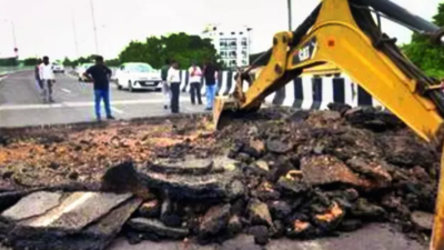 LUCKNOW/AYODHYA: The recently unveiled flyover on the busy Lucknow-Ayodhya-Basti-Gorakhpur national highway partially collapsed disrupting the movement of motor vehicles on the busy highway. An inquiry has been ordered to fix the responsibility while traffic diversions have been enforced to regulate the movement of two-wheelers and four-wheelers from the stretch.Taken up by the national highways authority of India (NHAI) in the Sahadatganj locality of Ayodhya, the flyover facilitated movement of motor vehicles plying via the national highway and had to be planned to avoid congestion on the Lucknow-Faizabad national highway and Ram Path trisection.However, having faced the first monsoon showers, the carriageway of the flyover developed cracks and cavities and also sank from the normal level, disrupting movement of motor vehicles.The construction work on the infrastructure project took place almost six months ago. Cracks had also emerged on the retaining walls of the structure. According to experts, the compacting of sand and earth material was not done up as per the required standards, leading to slipping away and sinking of the earth during the showers in the monsoon season.