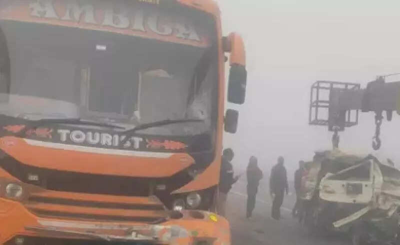 Kanpur: Four people, three brothers and their nephew, were killed and three other family members injured in a road accident on Bundelkhand Expressway near Ichauli village in Hamirpur on Sunday morning.The family from Mahoba was heading to Prayagraj for immersion of their mother’s ashes at Sangam when their Bolero was struck from behind by a sleeper bus in dense fog on the Bundelkhand Expressway.The woman died after a prolonged illness on Dec 7 and her last rites were conducted that day. On Sunday, seven members of the family borrowed a Bolero from a relative and set out with her ashes.The deceased were identified as Ram Sahodar (45), Ghanshyam (58), Radheshyam (50), and their cousin Sonu (38), who was driving the vehicle.The injured were identified as cousins Siddhgopal (60), Asharam (45) and Vimal (25). All belonged to Gayodi village in Mahoba.After the collision bystanders alerted the police, who had to force open the Bolero doors to retrieve the bodies. The injured were taken to the district hospital and later referred to a higher centre in Kanpur due to their critical condition. The bus driver fled the scene.The sleeper bus was carrying 48 pilgrims from Gujarat via Chitrakoot for the Char Dham pilgrimage. None of the bus passengers were injured and they were accommodated at a rest area on the expressway while another bus was arranged.Circle Officer Rajkumar Pandey stated that the accident was caused by dense fog and that efforts were underway to trace the driver.