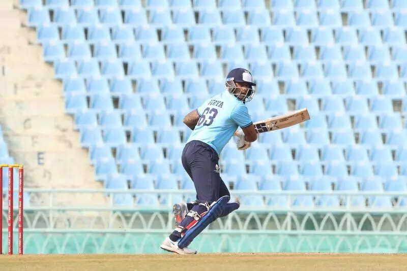 Lucknow: Ajinkya Rahane and Suryakumar Yadav brought the heat to the Ekana International Stadium on a cozy winter day, guiding defending champion Mumbai to a seven-wicket win in their Syed Mushtaq Ali Trophy opener against Railways.After restricting Railways to 158 for 5 in the allotted 20 overs, Mumbai romped home in 15.5 overs with seven wickets in hand. Chasing 159, openers Ayush Mhatre (18) and Rahane added 62 runs off just 26 balls before Ayush was caught by Ravi Singh off Rahul Sharma on the last ball of the powerplay. After his dismissal, Rahane and Surya forged a quickfire 51-run stand off 30 balls. Rahane smashed 62 off 33 balls, studded with four boundaries and five sixes, before he was out hit-wicket off Karn Sharma while attempting a sweep. Surya played with his usual flair, scoring 47 off 30 balls with five boundaries and two sixes before being trapped by Sharma. After Surya’s departure, wicketkeeper-batter Hardik Tamore (23) and the experienced Shivam Dube (5) completed the formalities. Earlier, Railways, led by former India leg-spinner Karn Sharma, had a disappointing start as openers SA Ahuja and Shivam Chaudhary (11) were back in the pavilion at 19/2 in 6.2 overs. Mohammad Saif then batted responsibly, scoring 48 off 37 balls with seven boundaries and a six, but his partner Ravi Singh (26) was caught by Suryansh Shedge off Atharva Vinod at 64/3 in 11.2 overs. After Ravi’s dismissal, Ashutosh Sharma smashed a brilliant 61 off 30 balls with seven boundaries and three sixes to lift the total, but it ultimately proved insufficient. Brief scores: Railways 158 for 5 in 20 overs (Mohammad Saif 48, Ashutosh Sharma 61; Shivam Dube 1/11) lost to Mumbai 159 for 3 in 15.5 overs (Ajinkya Rahane 62, Surya Kumar 47; Rahul Sharma 2/43).