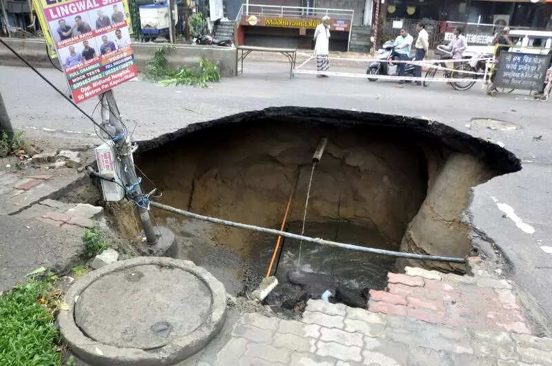 Lucknow: Heavy rain lashed the city on Wednesday night, flooding roads and damaging infrastructure in several areas. In Aliganj, a large section of the Kapoorthala road caved in, creating a deep crater about 15×20 feet wide and nearly 15 feet deep — large enough for a truck and a car to fall into.The collapse occurred between 1 am and 2 am and was first noticed by a night security guard. Two vehicles that got stuck in the crater were removed using a crane. Officials blocked the road, forcing commuters to take long detours and causing congestion in adjoining localities.The cave-in was caused by a combination of prolonged sewer leakage and structural damage originating from a nearby optical fibre cable chamber. Multiple rounds of horizontal directional drilling for optical fibre and electrical cables created pathways for rainwater to seep into soil, weakening ground beneath bituminous road layer.There was damage to underlying water supply line and sewer line collapsed further. Continuous sewer water flow increased risk of more cave-ins and a second crater, 10 to 15 feet deep, formed beside the first, which is now around 20 to 25 feet deep.Aliganj resident Aman Kumar Jaiswal said water often accumulated at the spot during rains, weakening the road. “We are facing problem commuting while our business too has come to a standstill,” he said. Vishal Kashyap, who works at a nearby shop, recalled that a small pothole formed at the same spot months ago but was only filled with soil. “Business will continue to suffer until repairs are done,” he said.Municipal commissioner Gaurav Kumar inspected the site with senior officials from jal kal department and Lucknow Municipal Corporation. He said repair of the damaged 1,500 mm diameter sewer line was being carried out on priority by SUEZ, a private firm hired by LMC for sewer maintenance. The area has been barricaded, and heavy machinery, including a Hydra crane and dewatering pump, deployed. At the site are 10 company workers, a supervisor and a six-member SUEZ-OCOP operations team are on site, supported by a safety emergency vehicle. SUEZ project director Rajesh Mathpal said, “Our team stabilised the area to prevent further damage.”Downpour caused waterlogging in KGMU Trauma Centre, Vidhan Sabha complex and several colonies in Gomtinagar, Aashiana and Buddheswar. A small crater formed in Mahanagar by waterlogging.In Buddheswar, residents protested against clogged drains and slow pumping operations. In low-lying areas, shops and homes were flooded and heavy losses were reported. Traffic jams hit Kanpur Road and Sarojininagar, worsened by muddy, pothole-ridden stretches near expressway construction sites. In PGI’s Eldeco Udyan Colony, cars were partially submerged, while Marine Drive went under knee-deep water.(With inputs from Shivendra Vikram Singh)
