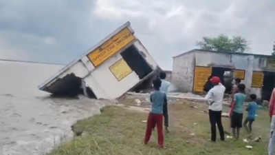 LUCKNOW: Strong Saryu river’s water flow on Wednesday triggered severe erosion in Shukulpurva of Sitapur district, causing extensive damage. River’s powerful currents washed away one room of the Shukulpurva Composite School, leaving the remaining structure at high risk. Around 24 homes and 25 bighas of fertile farmland have also been lost to the river’s relentless advance.Displaced families were evacuated by boat, relocating their belongings to safer areas. Sevata MLA Gyan Tiwari and Mahmoodabad Tehsildar Anil Kumar visited the site to evaluate the crisis. On Wednesday, 4.04 lakh cusecs of water were released from three barrages, with the river’s water level at 118.20 m, down 10 cm from Tuesday, intensifying the erosion.The decade-old, five-room Shukulpurva Composite School, serving 246 students, was evacuated four days prior after warnings from teachers. One room was swept away Wednesday afternoon, and the remaining four are now vulnerable. Students have been shifted to Kothar Primary School and the Shukulpurva Panchayat Bhawan, with school materials relocated and mid-day meal arrangements in place.Homes in Kunnapurva, Ramrooppurva, and Lodhanpurva, belonging to residents like Kriparam, Sankata, Amritlal, Ramvati, Aarti, and Parasram, have been destroyed, along with 25 bighas of cultivated land. With erosion continuing unabated, villagers are gripped by panic, hastily fleeing by boat.Udaymani Patel, Block Education Officer, Rampur Mathura said, “The Shukulpurva Composite School was under severe threat from Saryu River erosion. One room has collapsed into the river, but the building was evacuated in advance. Students are now studying at Kothar Primary School and Panchayat Bhawan, with mid-day meal arrangements ensured.”While Anil Kumar, Tehsildar, Mahmudabad said, “Despite the Saryu’s water level dropping, erosion has worsened. A survey will be conducted to assess losses, and affected families will receive appropriate assistance.”