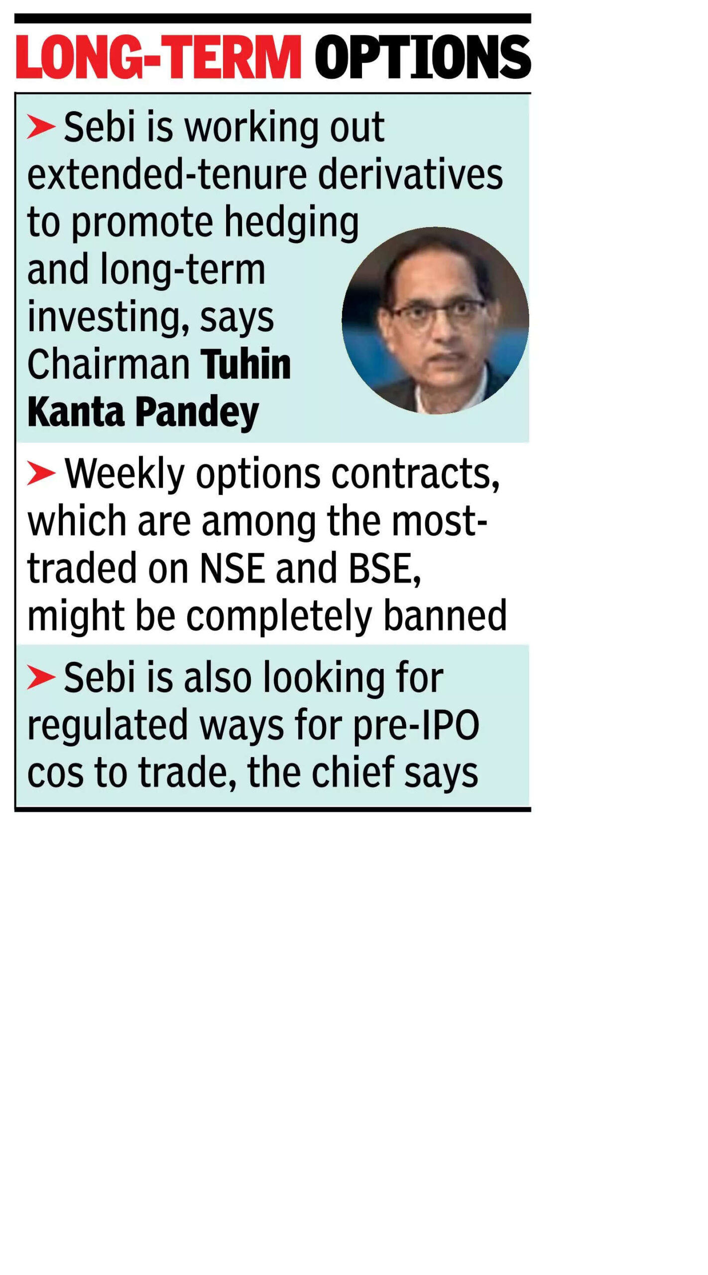 Mumbai: Market regulator Sebi is working on ways to extend the tenure of derivative (futures & options or F&O) contracts, a trouble area for the market regulator, as data show nine out of 10 retail participants lose money in this segment. Currently, retail participants trade more in weekly options contracts than in the relatively long-tenure ones of one-, two- and three-month maturities.Sebi chief Tuhin Kanta Pandey on Thursday hinted that the regulator would look to promote hedging and long-term investing in the market. In contrast, a large number of market experts believe the F&O space in India is used primarily for speculative activities.“We will consult with stakeholders on ways to improve in a calibrated manner and on the maturity profile of derivative products so that they better serve hedging and long-term investing,” Pandey said. He was speaking at FICCI’s annual Capital Market Conference. Market players expect Sebi to now completely ban weekly options contracts, one of the most traded contracts on both NSE and BSE, which also bring in big revenues for these bourses. Post Sebi chief’s comments, the stock prices of BSE crashed over 7.5%. Among the listed brokers with many clients trading in the F&O segment, Angel One was the most affected, with the stock crashing 6.7%.Market players welcome Sebi’s plan for longer tenure F&O contracts. “As the world’s fifth-largest equity market , India needs markets that front-end growth,” said Venkatachalam Shunmugham, Founding Partner, MCQube, a securities market thinktank. “A move to one-monthly expiry helps shift focus back to resilient cash markets and vibrant fundraising,” he said.