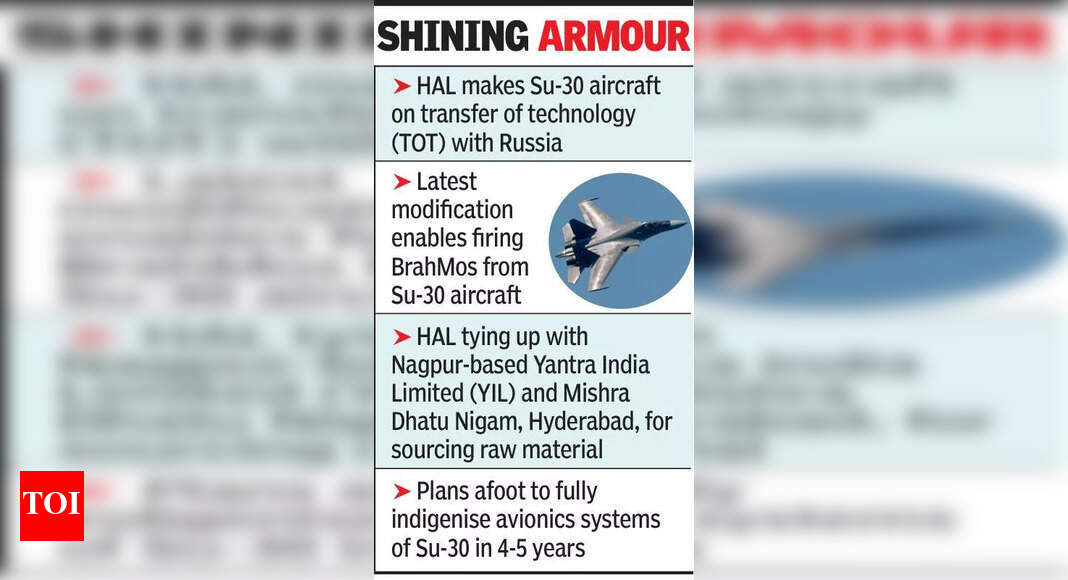 Nagpur: The Russian Sukhoi Su-30 fighter aircraft was modified 100 times at Hindustan Aeronautics Limited (HAL) and the supersonic missile, BrahMos, is one of the successful additions to the aircraft, said HAL’s chief executive officer (CEO), Saket Chaturvedi on Monday. The CEO’s reference was to a recent addition that enables firing BrahMos from Su-30 aircraft.HAL has been manufacturing the aircraft on transfer of technology (TOT) with Russia. Chaturvedi stressed that HAL has gone a long way, making 100 modifications to the aircraft and this was possible because India had secured the TOT. He was speaking at a book launch at National Academy of Defence Production (NADP) — a training wing under Munitions India Ltd.Later, talking to TOI on the sidelines of the function, Chaturvedi said the modifications helped in enhancing its capability. The Su-30 is being made directly through raw material, and HAL is also tying up with other PSUs like Nagpur-based Yantra India Limited (YIL) and Mishra Dhatu Nigam in Hyderabad for sourcing the material. YIL is a PSU formed out of erstwhile ordnance facilities and is primarily engaged in making empty ammunition shells.Chaturvedi said there are plans to completely indigenise the avionics systems of the Su-30 too. This is expected to happen in 4 to 5 years, after which nearly 75% of the fighter plane would be indigenised, he said.Avionics are electronic equipment fitted in the aircraft, like the weather radar, flight management system, or GPS, which assist in flying, explained a source. Chaturvedi said the MiG-21 phase-out will be done at a grand function on September 26. “MiG-29s would continue to be operational,” he said.The book authored by two HAL officers and launched by Chaturvedi also mentions issues faced by HAL on Russian avionics. It says the licensor still holds a few secret cards by supplying critical avionic articles like mission computers, laser systems, optical displays, navigation systems as ready-made articles of Russian origin. The electrical interface and technical knowhow of the equipment is not disclosed. And this is important for technology absorption and upgradation.
