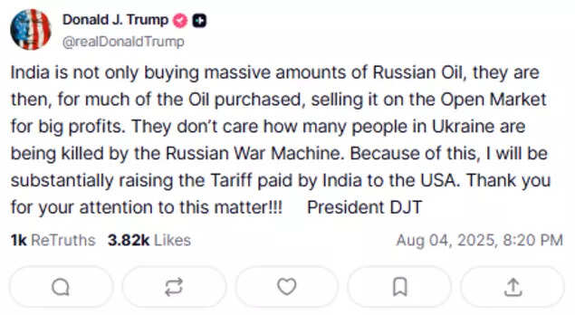 US President Donald Trump on Monday criticised India for continuing to purchase Russian oil, accusing New Delhi of profiting from the war in Ukraine and warning that it will face a “substantial” increase in tariffs.In a post on Truth Social, the US President accused New Delhi of indifference to the conflict in Ukraine, stating: “India is not only buying massive amounts of Russian Oil, they are then, for much of the Oil purchased, selling it on the Open Market for big profits. They don’t care how many people in Ukraine are being killed by the Russian War Machine. Because of this, I will be substantially raising the Tariff paid by India to the USA.”